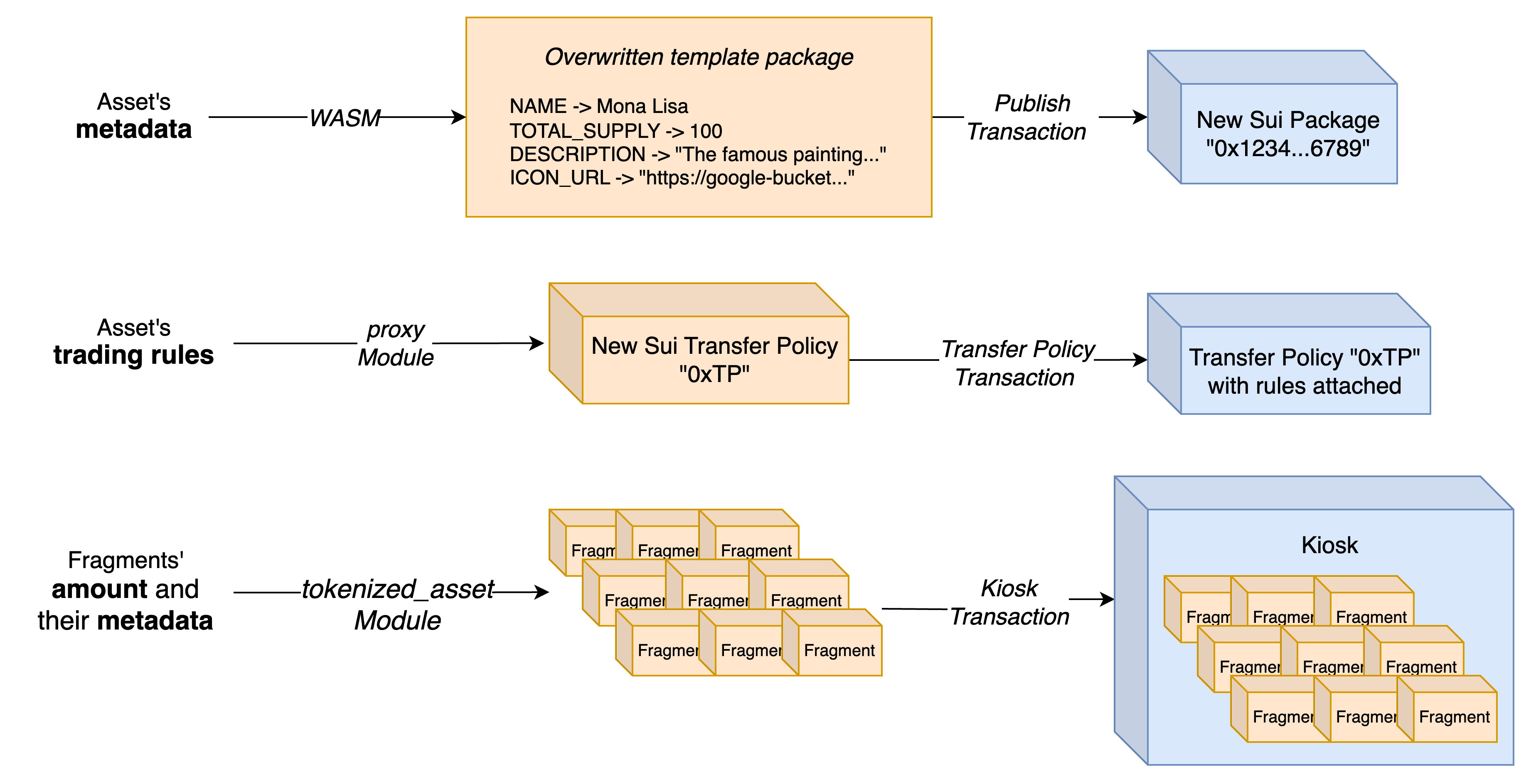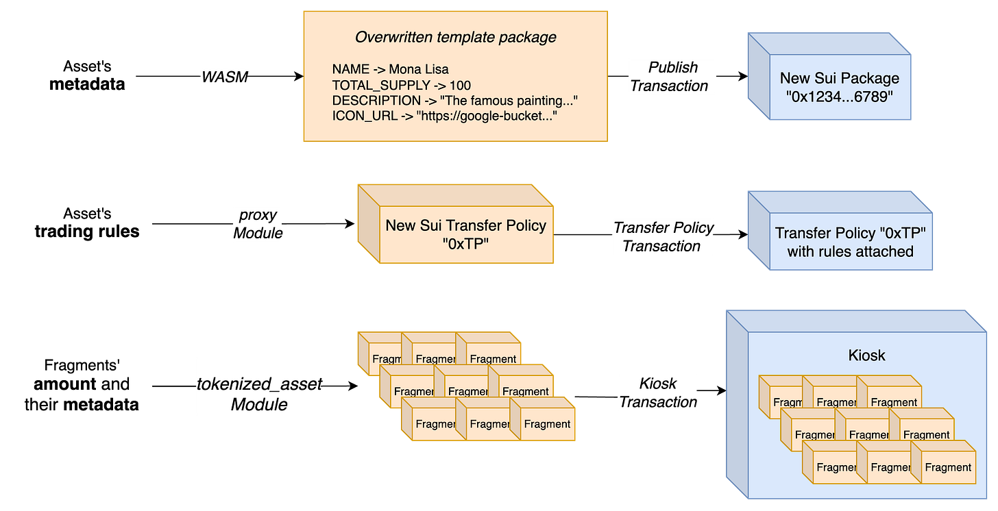 Each asset is deployed as a separate package on Sui, with the fragments that belong to this asset being Sui objects of a specific type. As a practical example, you can imagine that publishing the famous piece of art “Mona Lisa”, and tokenising it into 100 fragments would result in the creation —among others— of the following: